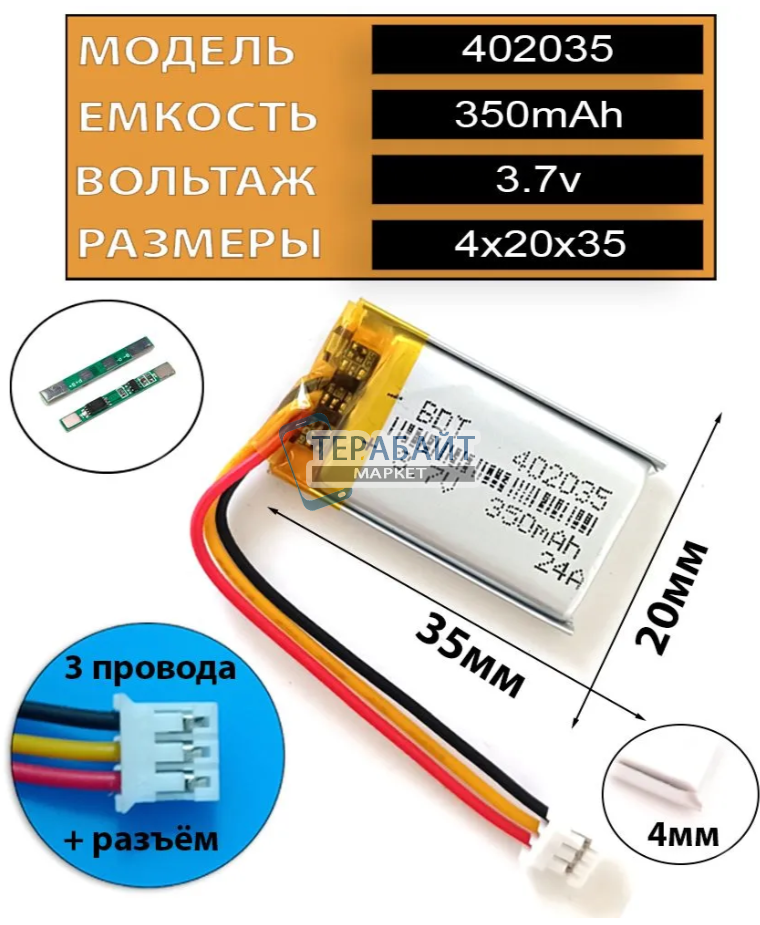 УНИВЕРСАЛЬНЫЙ АККУМУЛЯТОР (АКБ БАТАРЕЯ) Аккумулятор 3.7v 350mAh 3pin 3 провода + разъем (фишка) коннектор