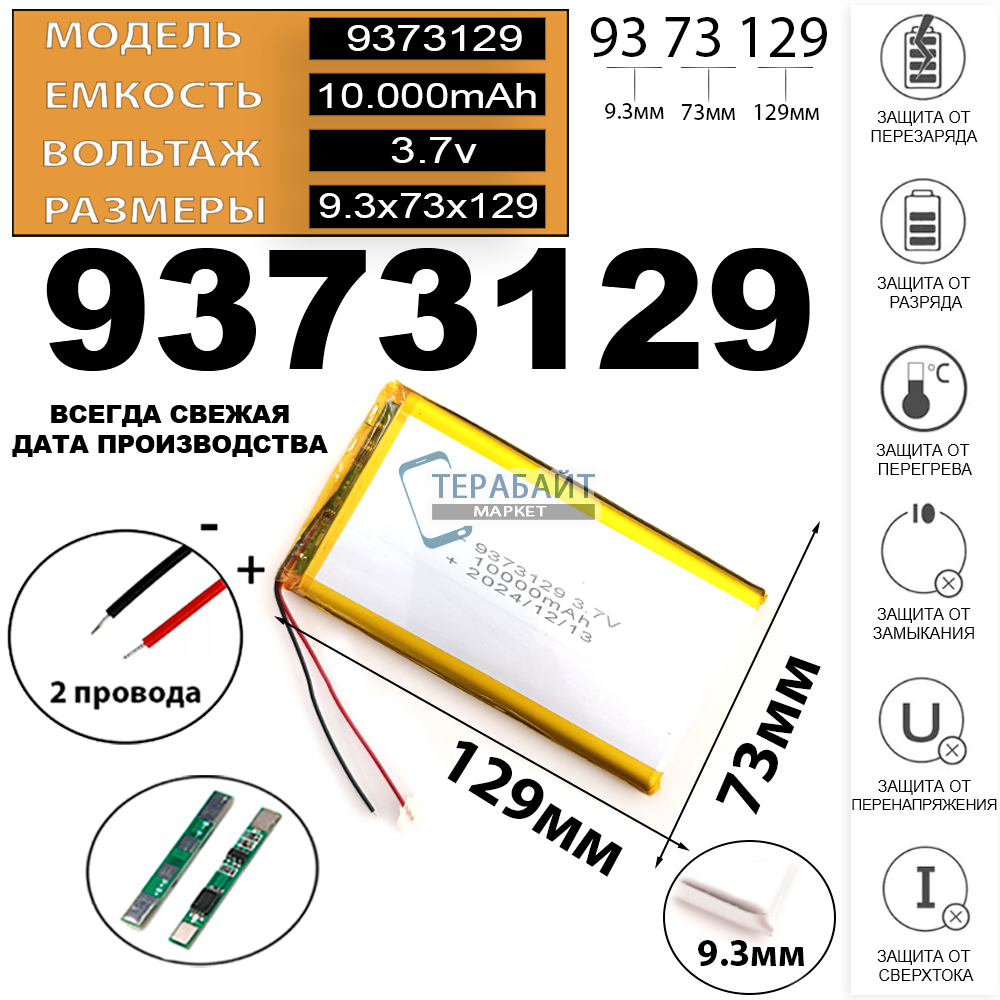 Аккумулятор 3.7v 10000mAh 2pin 9373129 Li-Pol для powerbank повербанка универсальная батарея 9.3x73x129 2 провода