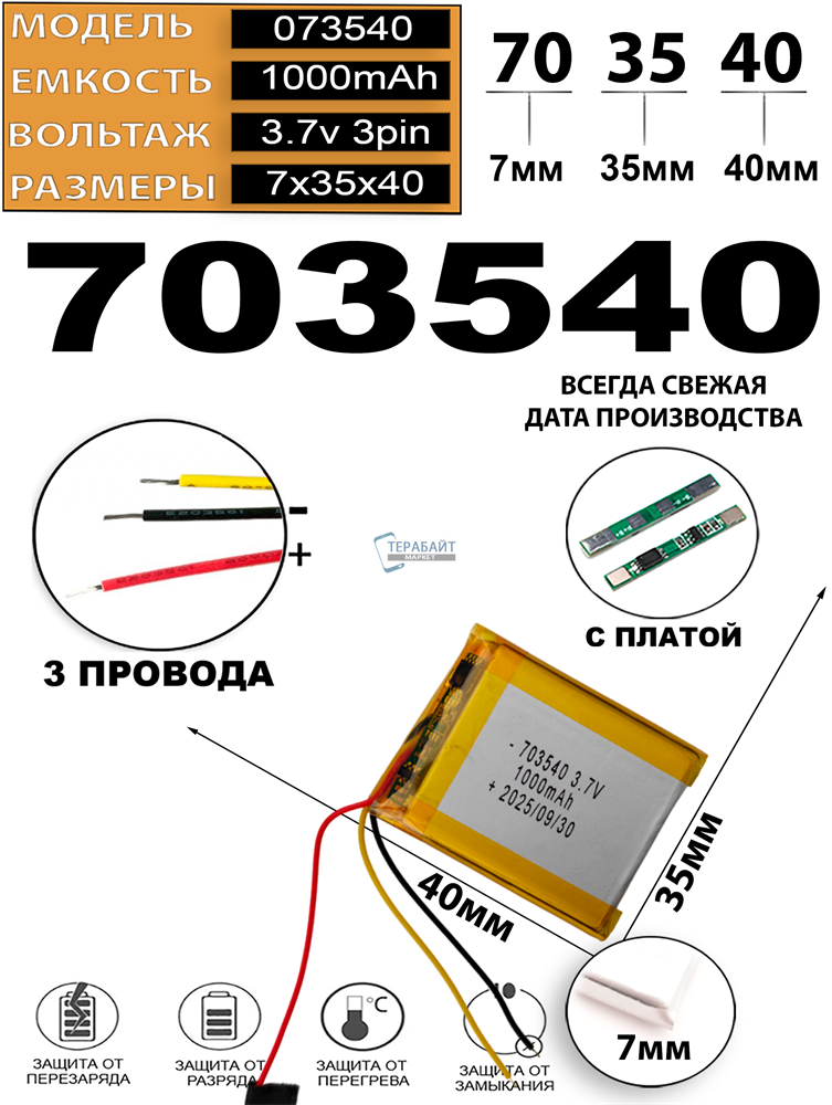 АККУМУЛЯТОР 703540 3 провода 1000mAh