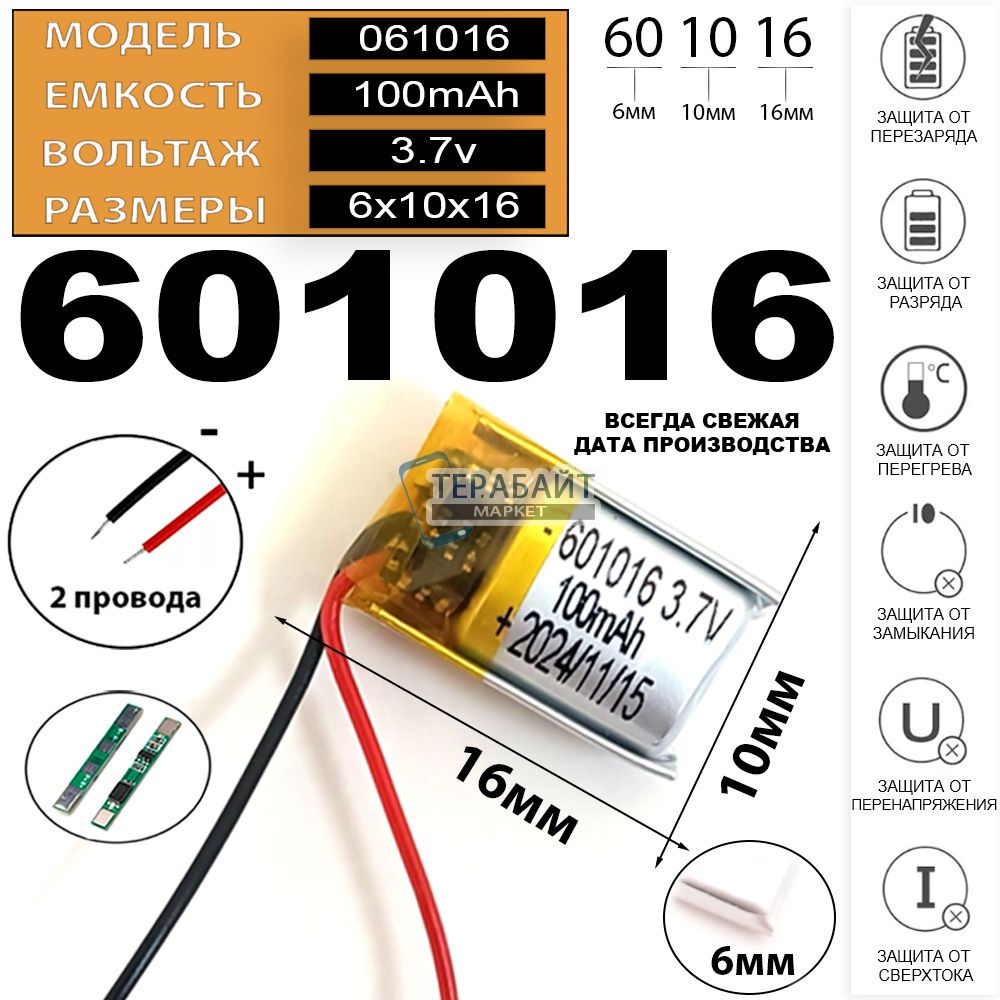 Аккумулятор 3.7v 100mAh 6x10x16 / 601016 / 16мм на 10мм на 6мм