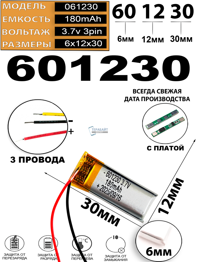 АККУМУЛЯТОР 601230, 2 pin 2 провода 180mAh