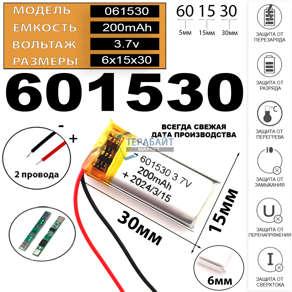 Аккумулятор универсальный 601530 2 провода 3.7v 200mAh Li-Pol батарея 2pin + плата