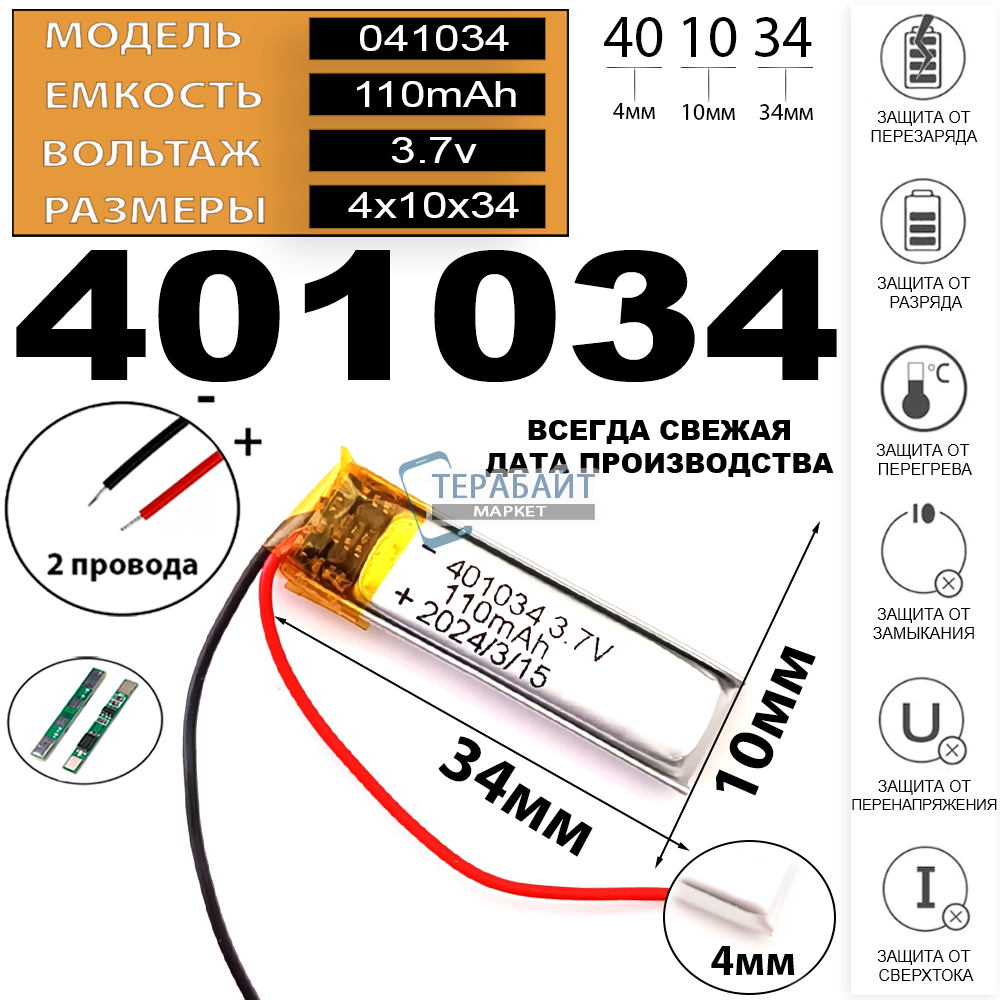 Аккумулятор универсальный 3.7v 110mAh 4x10x34 / литий-полимерный защита платы заряда-разряда / 2 провода / 401034 акб батарея