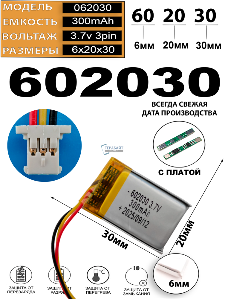 Ищите надежный интернет магазин по продаже запчастей для планшетов, телефонов, ноутбуков и другой электроники? У нас на сайте в разделе Аккумуляторы по размерам вы можете приобрести Аккумулятор 3.7v 300mAh 3pin 3 провода + разъем (фишка) коннектор 602030 Li-Pol универсальная аккумуляторная батарея 6x20x30 за 320 руб. оригинал или аналог с доставкой в любой город или оформить самовывоз и получить ваш заказ Аккумулятор 3.7v 300mAh 3pin 3 провода + разъем (фишка) коннектор 602030 Li-Pol универсальная аккумуляторная батарея 6x20x30 самовывозом в нашем магазине в удобном пункте выдачи. Оплатить заказ можно наличными, электронными деньгами, банковской картой, по банковскому счету, наложенным платежом или по безналичному расчету. Гарантия на Аккумулятор 3.7v 300mAh 3pin 3 провода + разъем (фишка) коннектор 602030 Li-Pol универсальная аккумуляторная батарея 6x20x30 3 месяца. Огромный выбор оригинальный запчастей напрямую от поставщиков. Если вы ищите где купить и не знаете как подобрать тачскрин, сенсор, экран, дисплей, аккумулятор, матрицу, клавиатуру, блок питания или другую запчасть, наш менеджер ответит на любые вопросы.