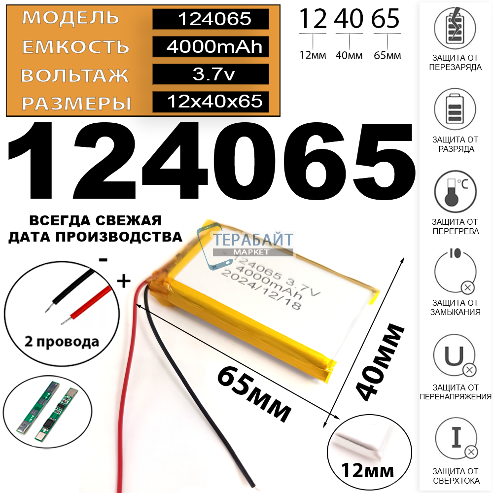 АККУМУЛЯТОР 124065 2 провода 4000mAh