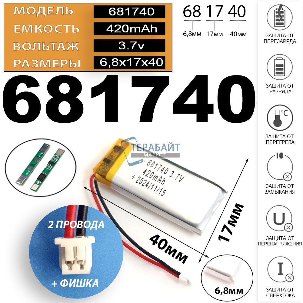 АККУМУЛЯТОР 681740 2 провода с коннектором 420mAhУНИВЕРСАЛЬНЫЙ АККУМУЛЯТОР (АКБ БАТАРЕЯ) Аккумулятор 3.7v 420mAh 2pin 2 провода + разъем (фишка) коннектор