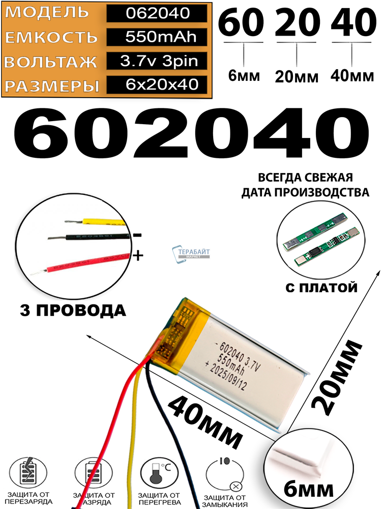 АККУМУЛЯТОР 602040 , 3 pin 3 провода 550mAh