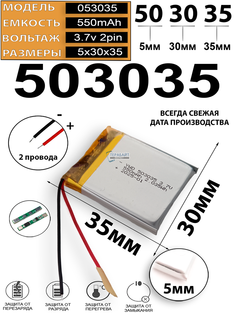 Аккумулятор 3.7v 550mAh 5x30x35 / 503035 / 35мм на 30мм на 5мм