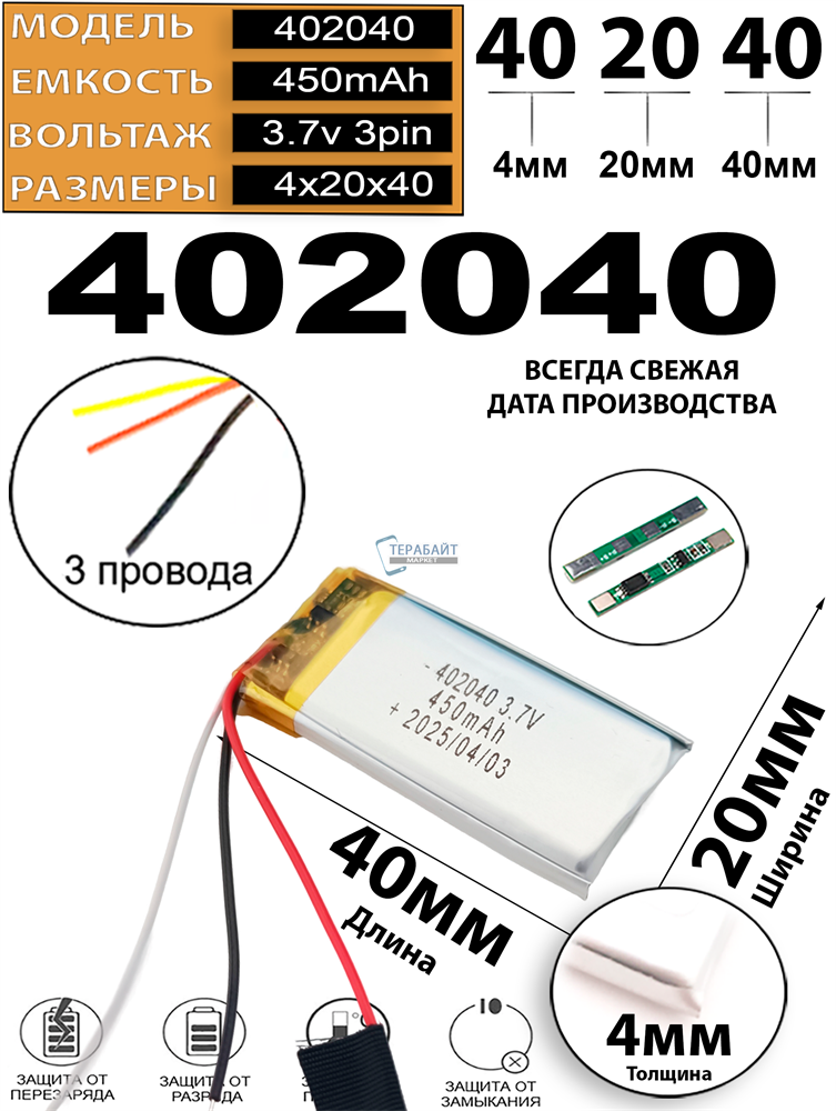 4мм на 20мм на 40мм 3.7V + защита плата заряда-разряда 3 провода