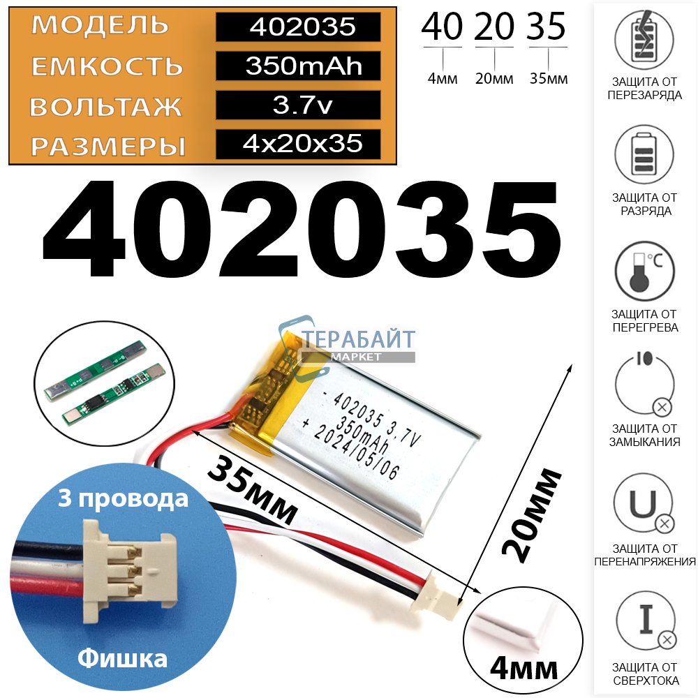 АККУМУЛЯТОР ДЛЯ ВИДЕОРЕГИСТРАТОРА УНИВЕРСАЛЬНЫЙ (БАТАРЕЯ) 4мм на 35мм на 20мм 3.7V + защита плата заряда-разряда 3 провода 3.7v 350mAh 3pin 3 провода + тонкий разъем (фишка) коннектор