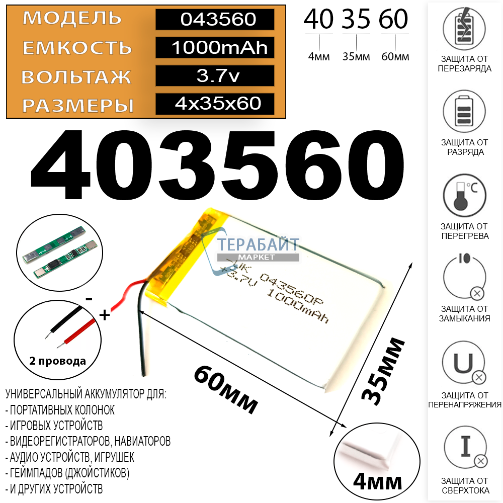 Аккумулятор универсальный 3.7v 1000mAh 4x35x60 / 403560 / 60мм на 35мм на 4мм