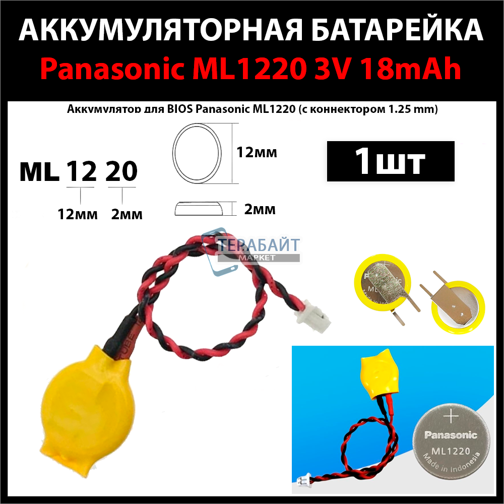 Перезаряжаемая аккумуляторная батарейка BIOS Panasonic ML1220 2 провода + коннектор (фишка 1.25мм) 3V 18mAh для Dell XPS13 9343 9350 9360 9365 9570