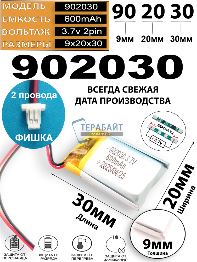 9мм на 20мм на 30мм 3.7V + защита плата заряда-разряда 2 провода + разъем фишка (коннектор)