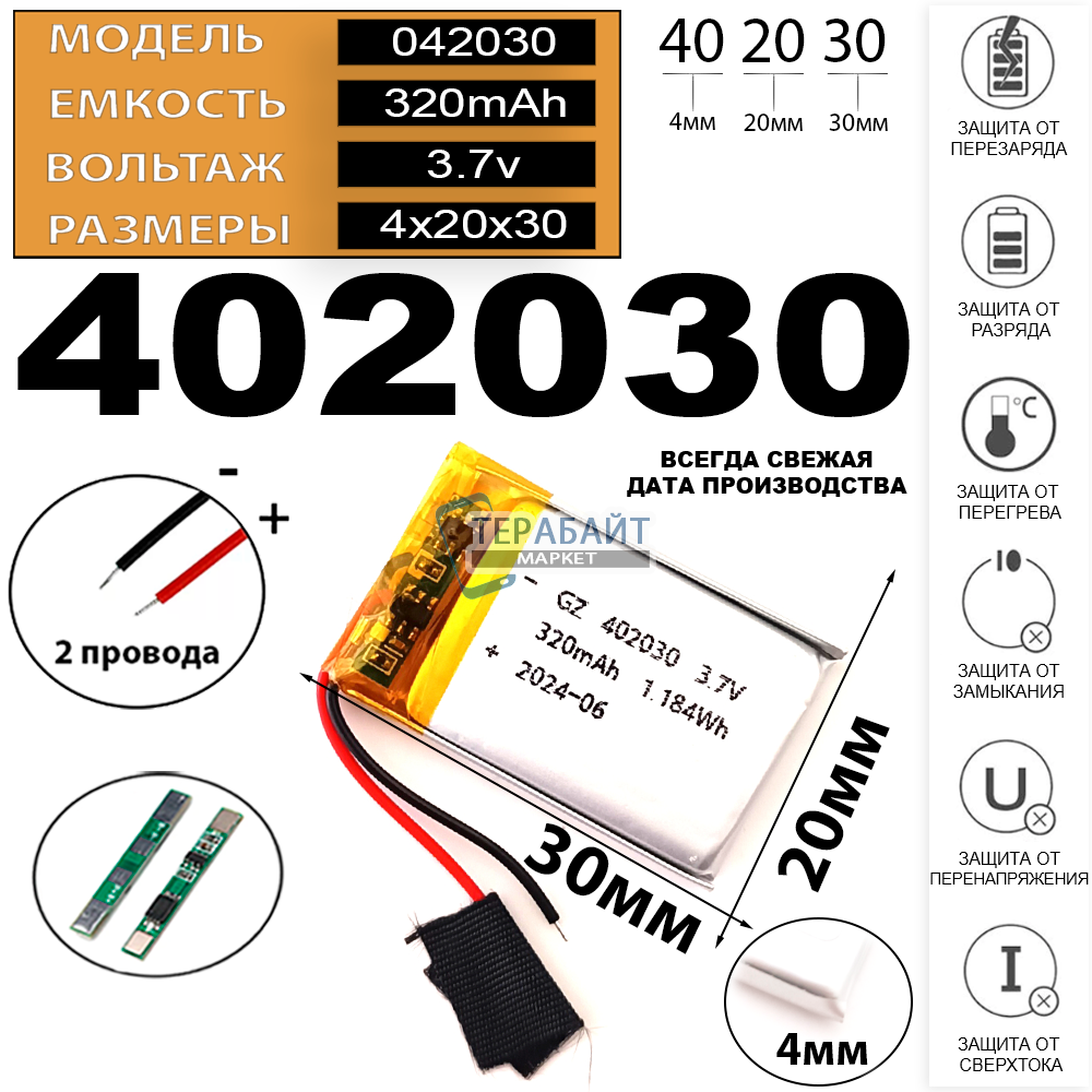 4мм на 20мм на 30мм 3.7V + защита плата заряда-разряда 2 провода