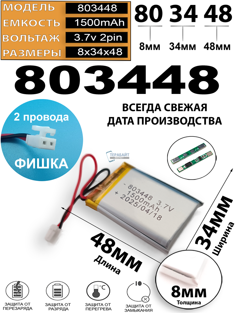 8мм на 34мм на 48мм 3.7V + защита плата заряда-разряда 2 провода + разъем фишка (коннектор)