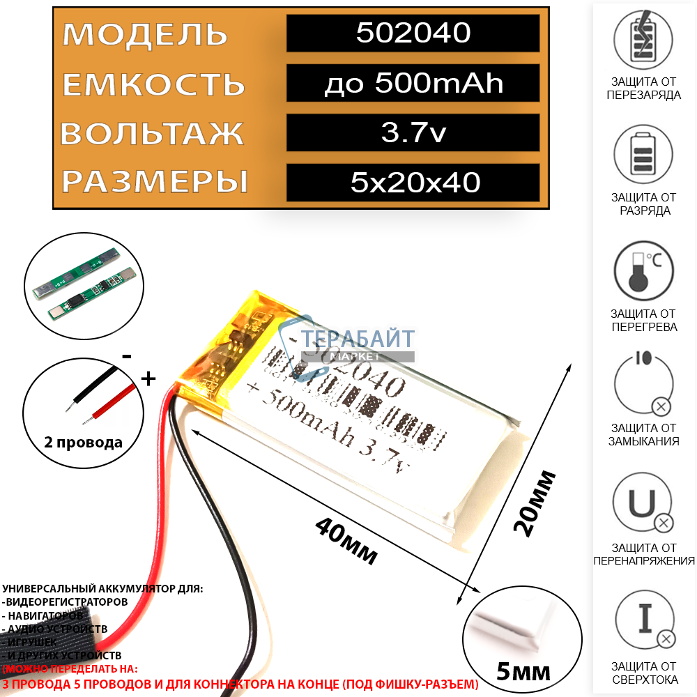 Код Аккумулятора: 502040 052040 552040 502141 502242