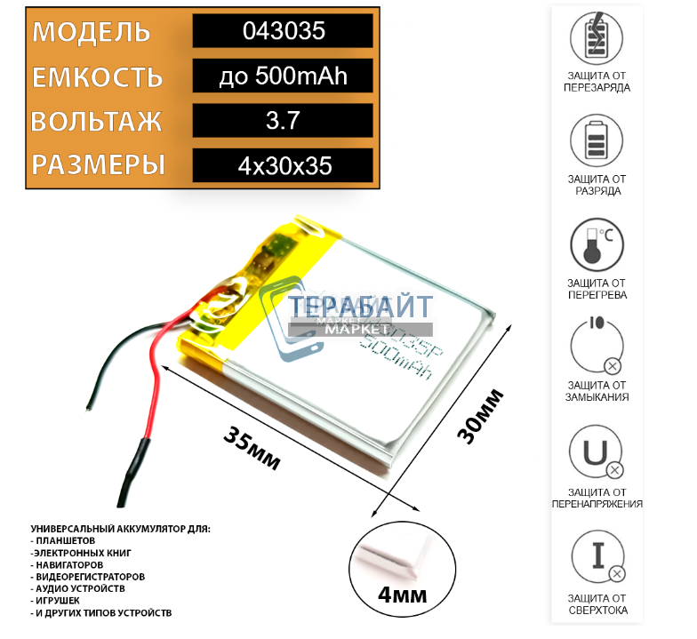 Предлагаемый нами аккумулятор 4мм на 35мм на 30мм