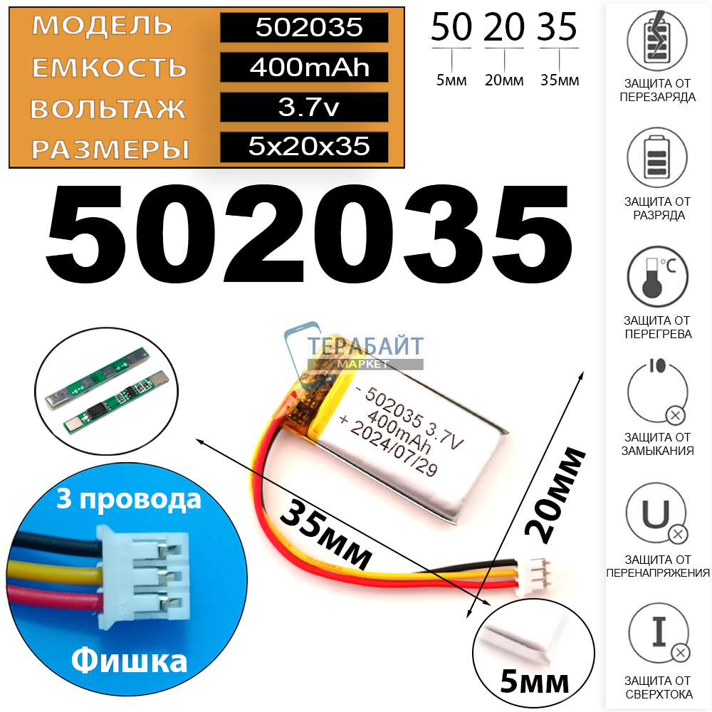 5мм на 35мм на 20мм 3.7V + защита плата заряда-разряда 3 провода 3.7v 400mAh 3pin 3 провода + разъем (фишка) коннектор
