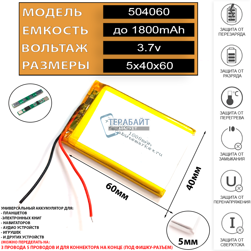 5мм на 40мм на 60мм 3.7V + защита плата заряда-разряда 2 провода