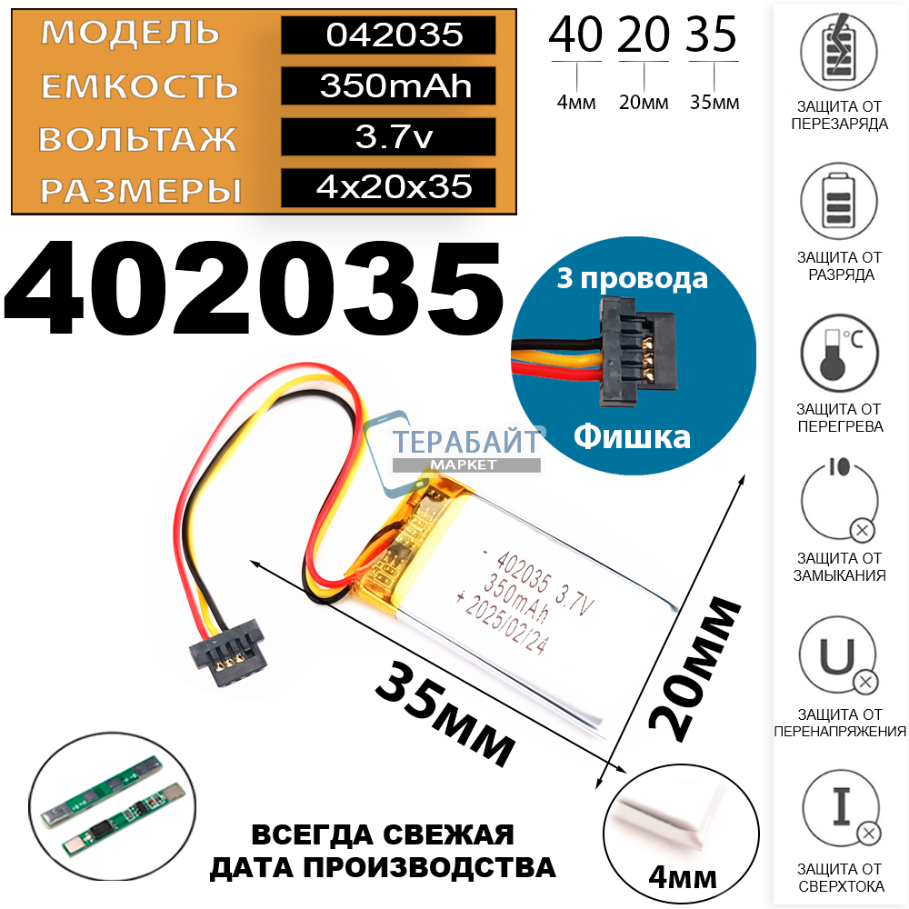 4мм на 20мм на 35мм 3.7V + защита плата заряда-разряда 3 провода 3.7v 350mAh 3pin 3 провода + разъем (фишка) коннектор