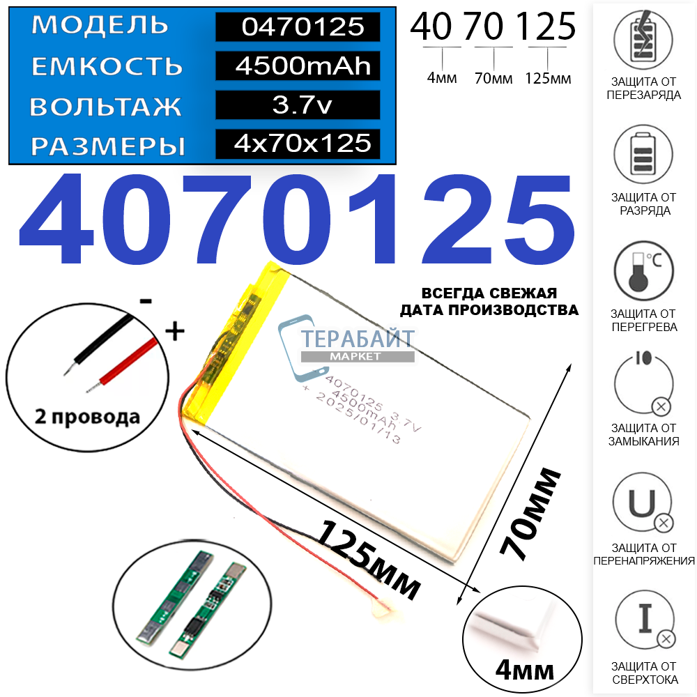 УНИВЕРСАЛЬНЫЙ АККУМУЛЯТОР (АКБ БАТАРЕЯ) 4мм на 70мм на 125мм 3.7V + защита плата заряда-разряда 2 провода 2pin