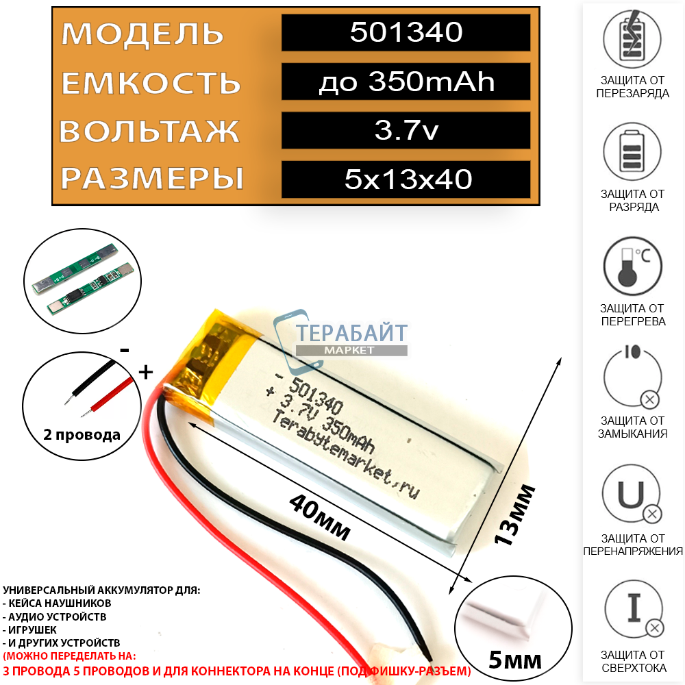 • 🔌 Кол-во проводов: 2 провода + плата защиты заряда - разряда ( можно переделать на 3 провода + коннектор )