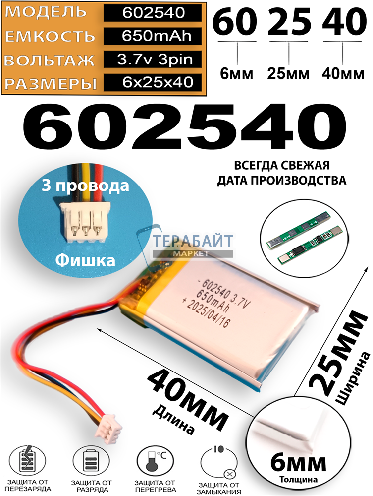 Аккумулятор 3.7v 650mAh 3pin 3 провода + разъем (фишка) коннектор